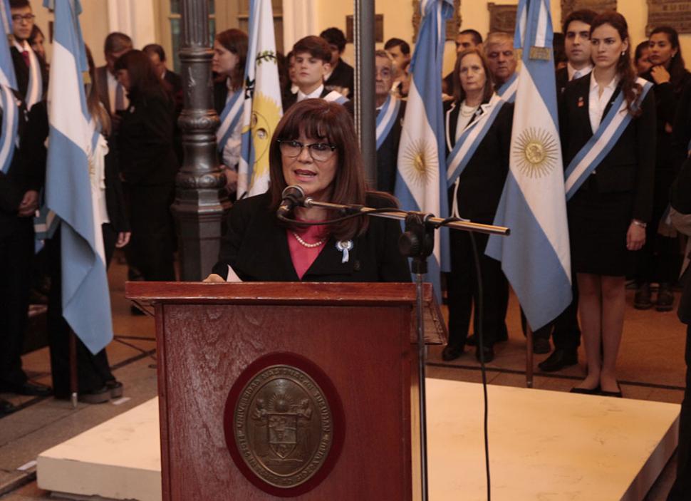 El mensaje central estuvo a cargo de la decana de la Facultad de Filosofía y Letras Mercedes Leal, quien estableció un paralelismo entre los valores e ideales que sostuvieron la Revolución de Mayo y los que incentivaron la Reforma Universitaria de 1918. Llamó a los universitarios a sostener esos principios en los tiempos actuales en momentos de crisis sociales, de hechos de violencia y de grandes divisiones.