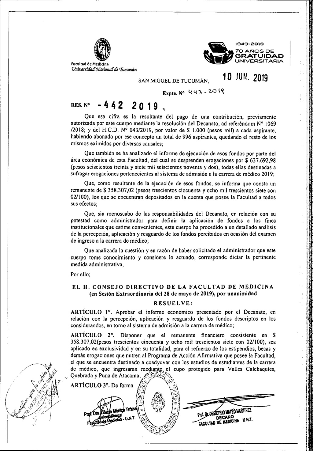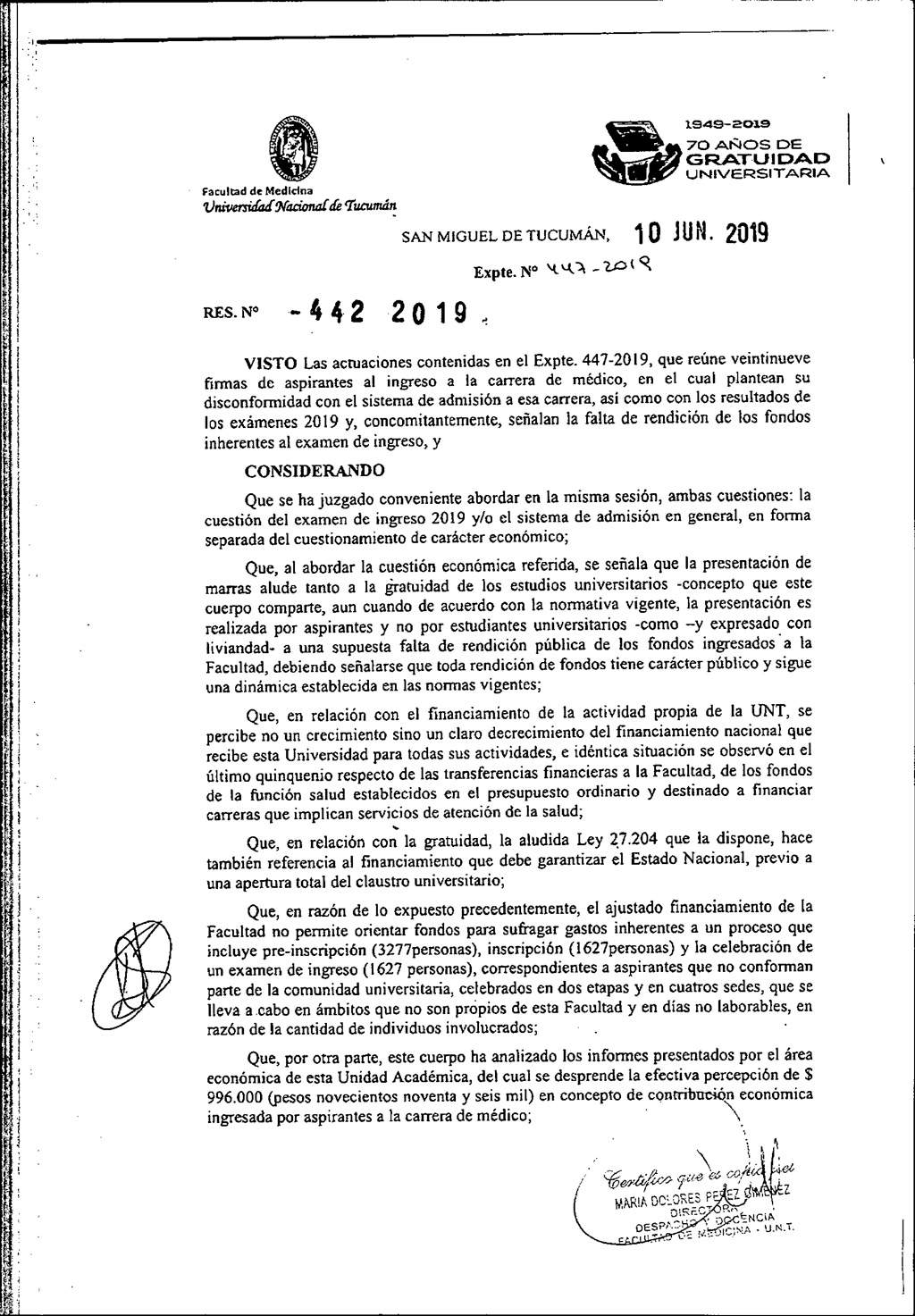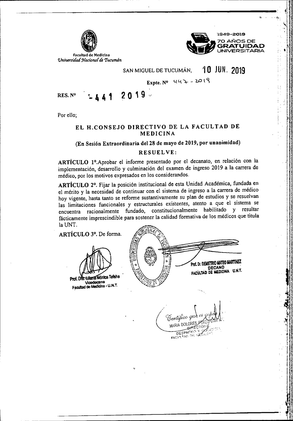 La autoridad institucional de la Facultad de Medicina informa a su comunidad educativa que, como producto de la oportuna reunión extraordinaria realizada por el HCD en relación con la petición de 24 aspirantes a ingresar a la carrera de médico, y que no alcanzaran puntaje suficiente para ser incluidos en el Cupo 2019, ha resuelto por unanimidad y dictado las resoluciones N° 441/2019/HCD y 442/2019/HCD.