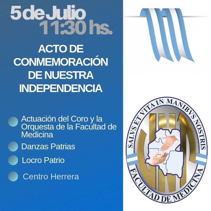La Facultad de Medicina, como toda institución educativa, celebra las fechas patrias, e invita a toda su comunidad educativa al acto de conmemoración de nuestra Independencia en el Centro Herrera, el próximo viernes 5 de julio a las 11.30 hs.