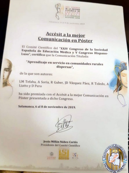 Felicitaciones a los docentes que participaron en el XXIV Congreso de la Sociedad Española de Educación Médica y V Congreso Hispano-Luso, quienes obtuvieron un Premio a la "Mejor Comunicación en Póster" presentada en dicho congreso.