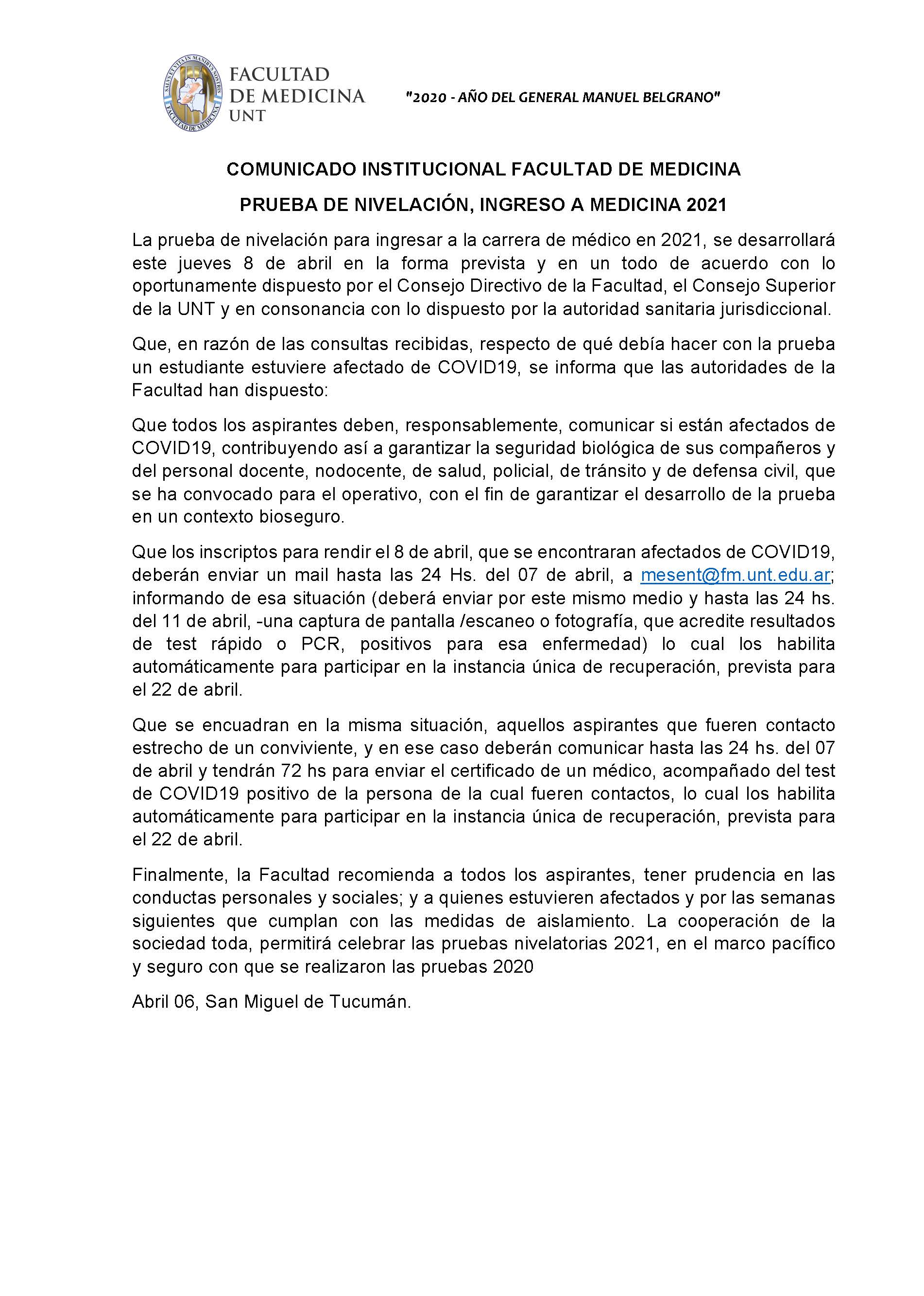 Debido a disposiciones del gobierno de Catamarca referente a la pandemia, la Facultad de Medicina de la UNT informa que: la prueba de nivelacion para ingreso 2021 se realizará en Amaicha del Valle. Comunicarse con la Coordinadora para ultimar detalles.