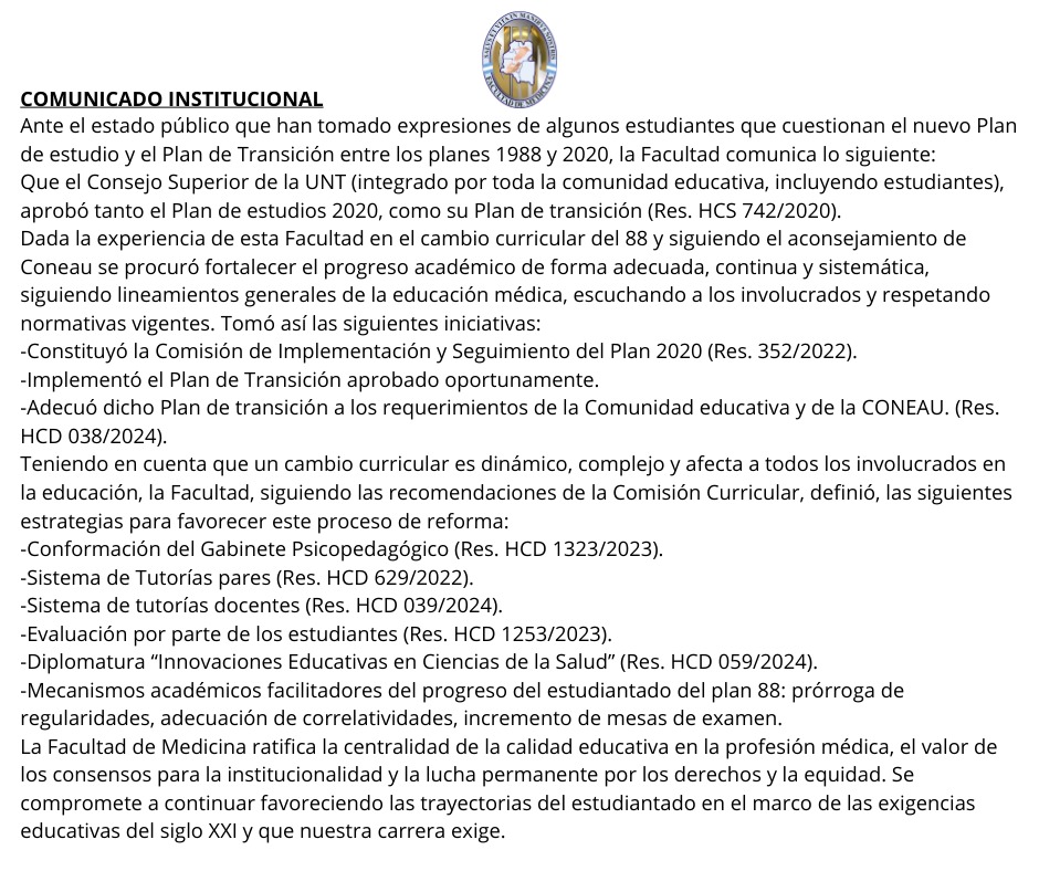 Res. 067-2024 Aut. en forma transitoria condiciones para el cursado de la Carrera de Medicina Plan de estudios 1988