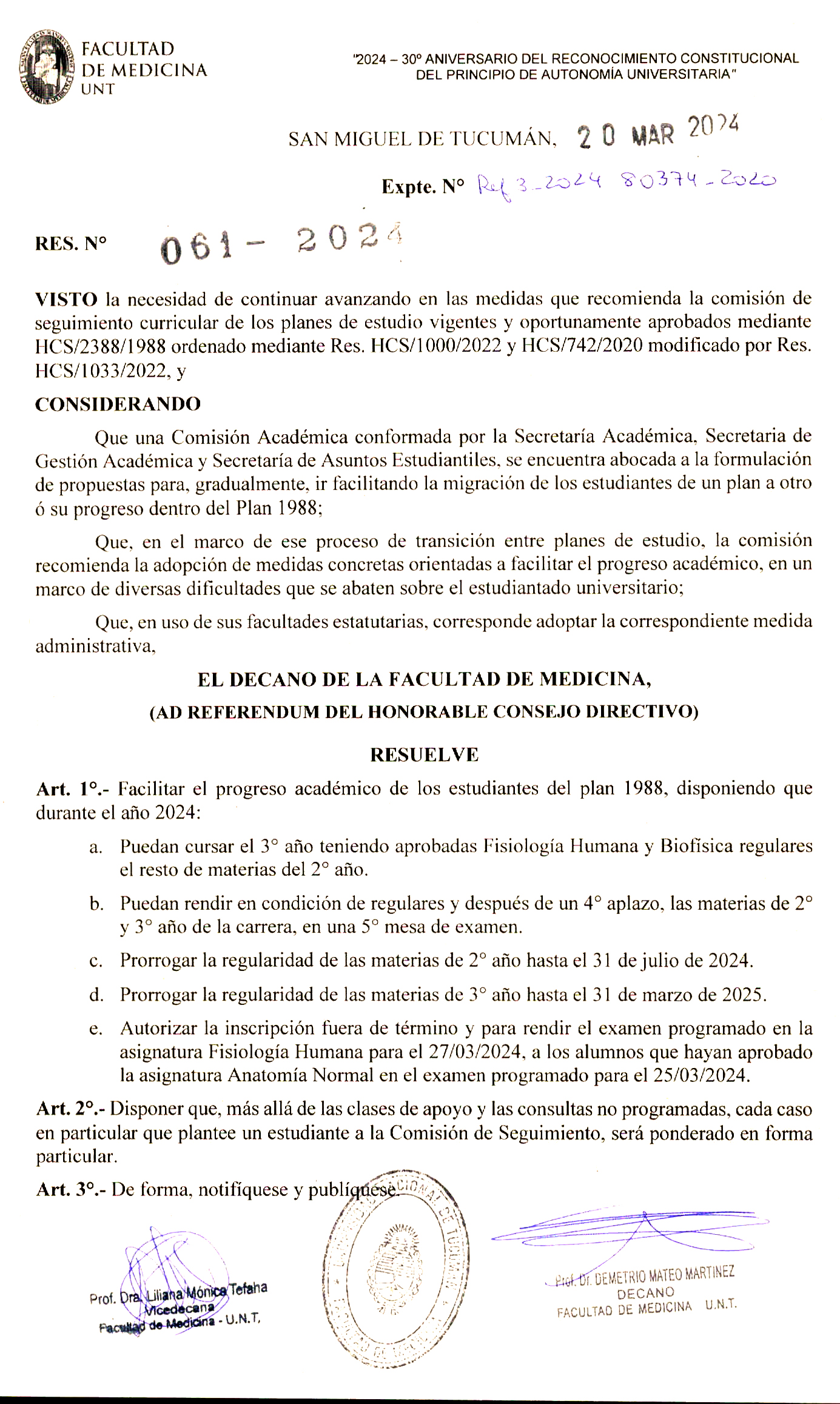 Res. 006-2024 Autorizar implementación de una mesa de examen final de la materia Bioquímica, plan de estudios 1988