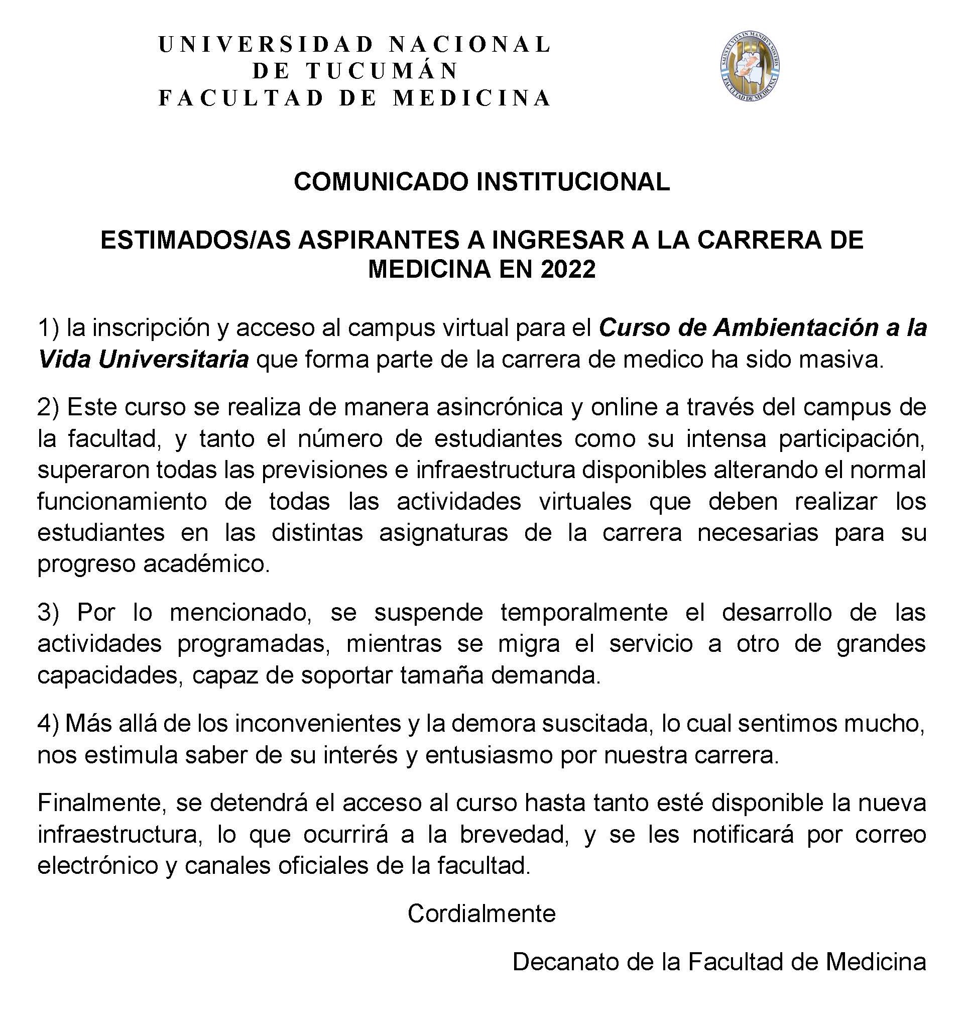 COMUNICADO INSTITUCIONAL SOBRE LA CARRERA DE MÉDICO