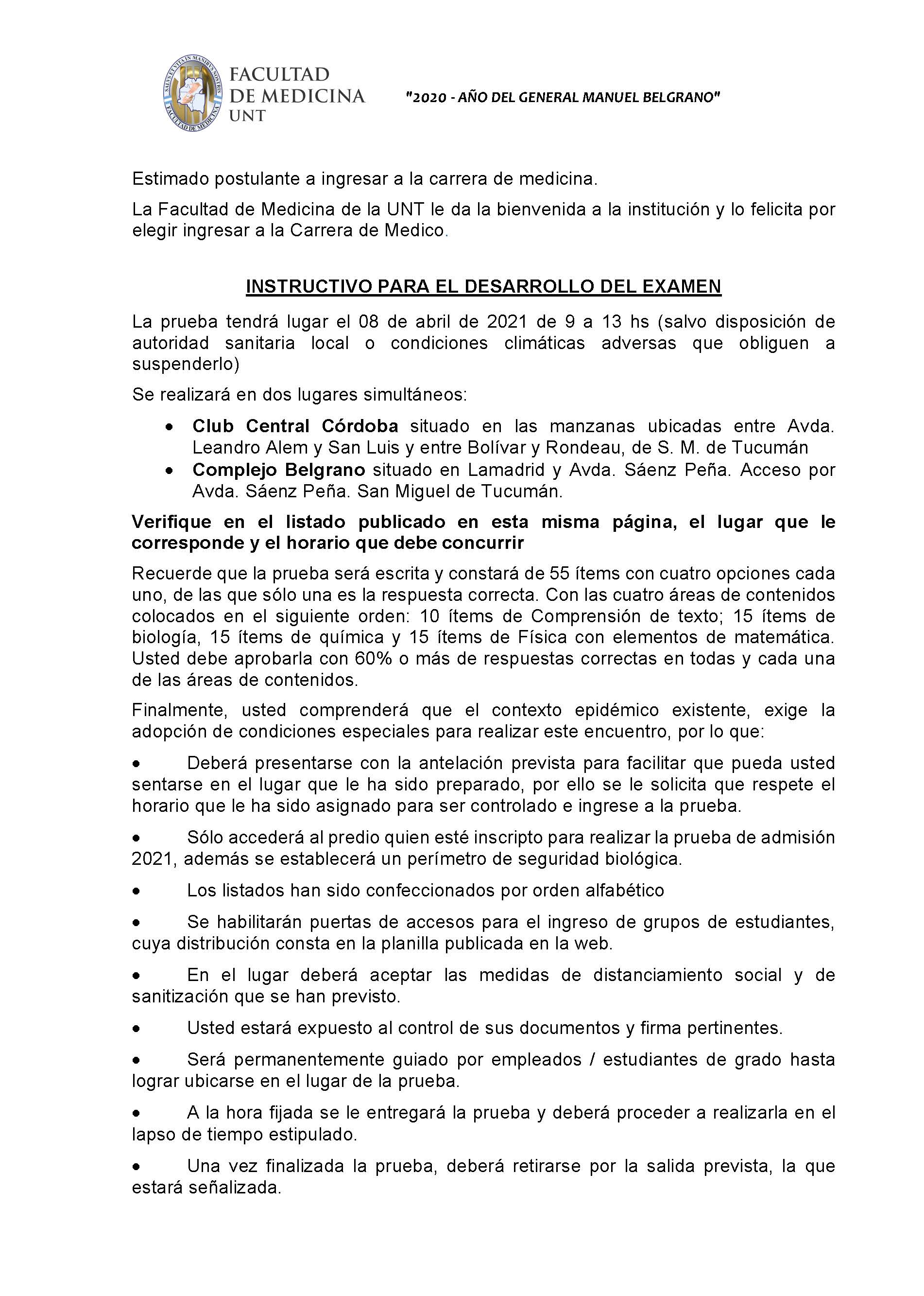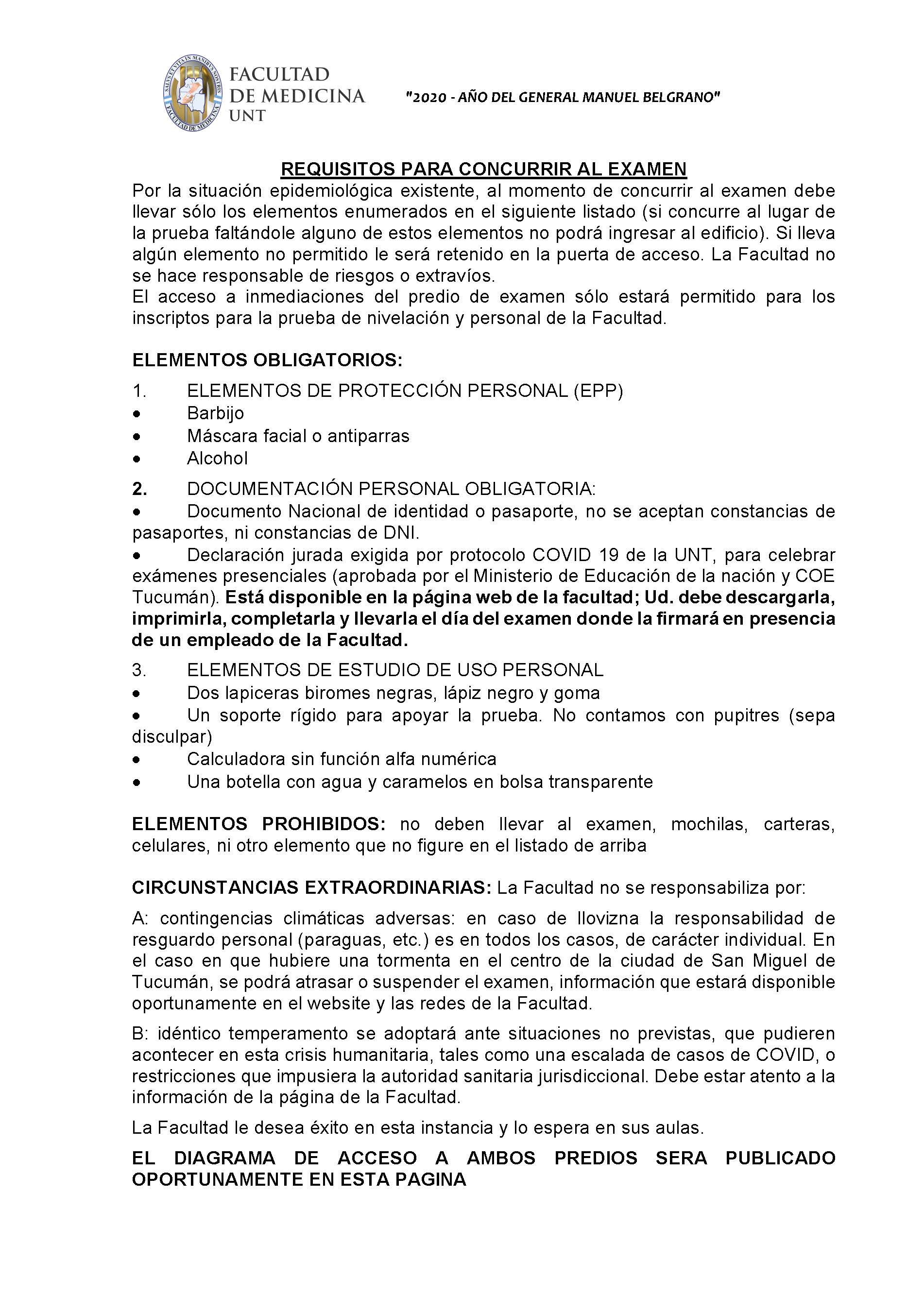 INFORMACIÓN Y REQUISITOS PARA EL DESARROLLO DE LA PRUEBA DE NIVELACIÓN DE INGRESO MEDICINA 2021 DEL DIA 08 DE ABRIL DE 2021 EN SEDE SAN MIGUEL DE TUCUMAN