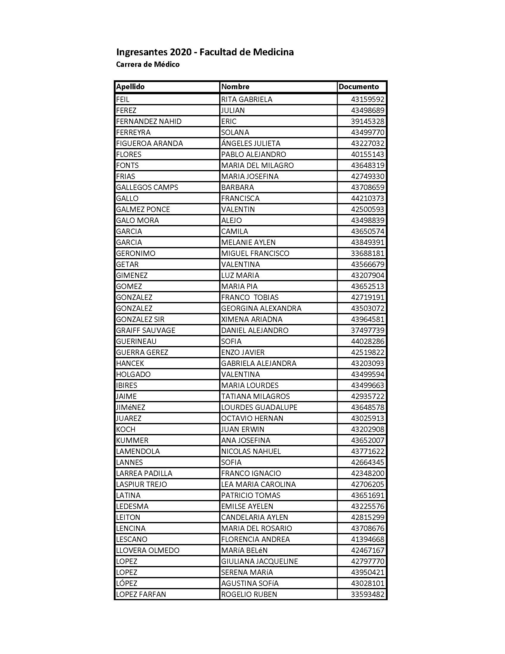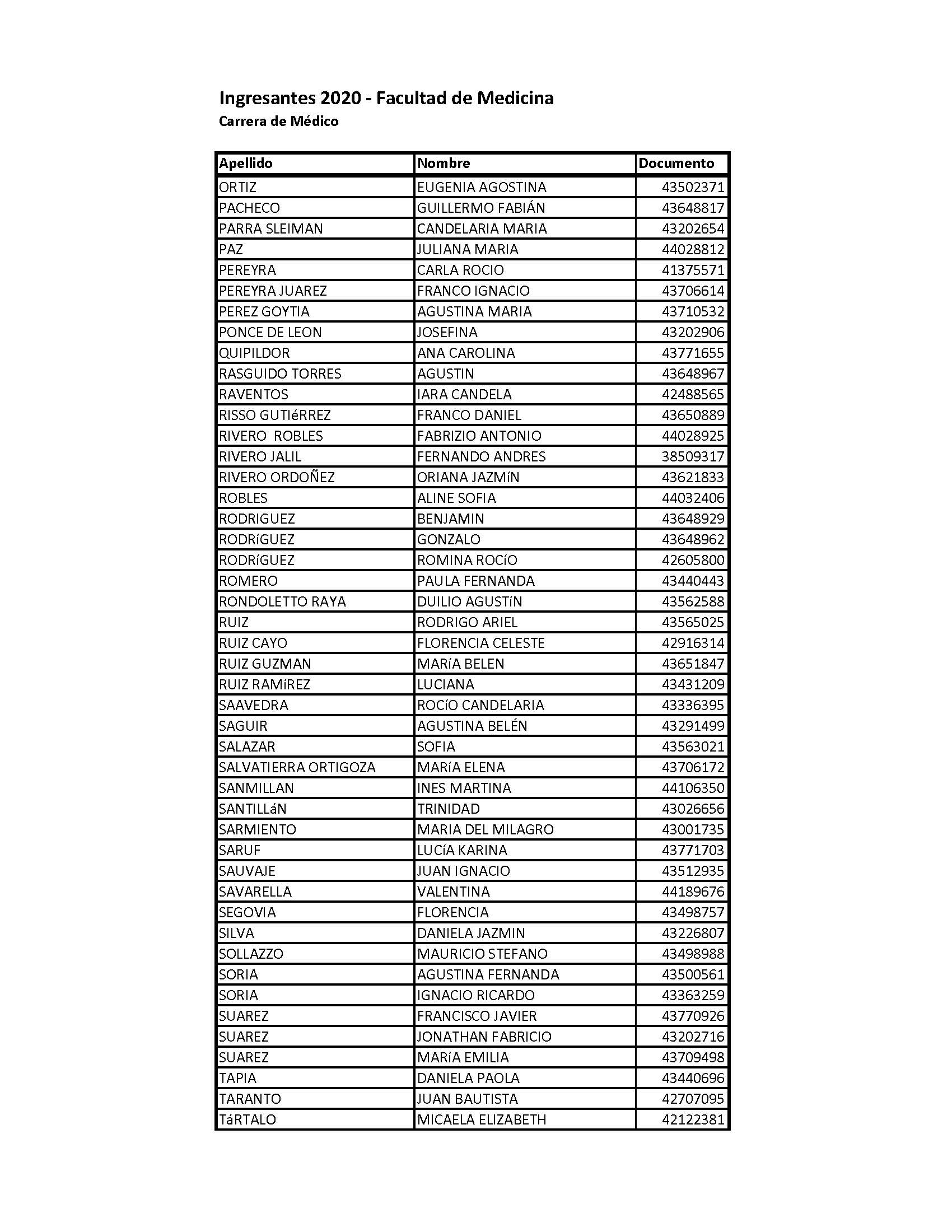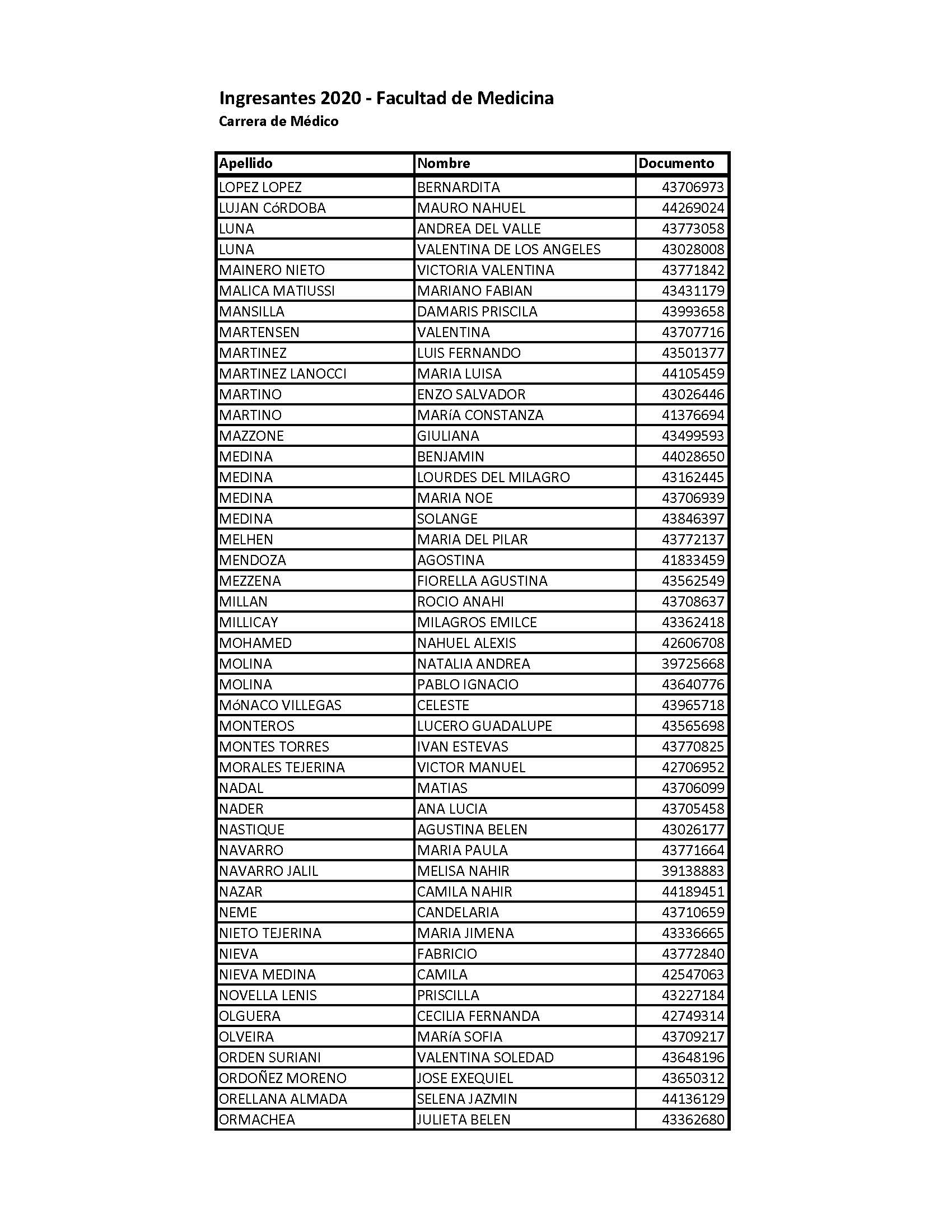 - La lista de ingresantes a la carrera de Medico como resultado de las Pruebas de Nivelación y Recuperación realizadas en febrero de 2021.