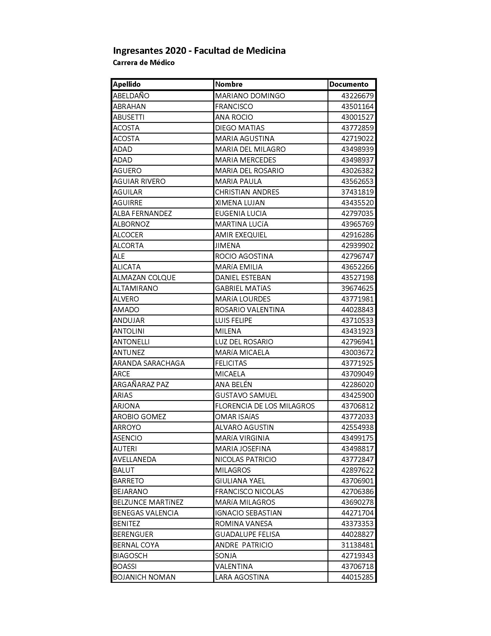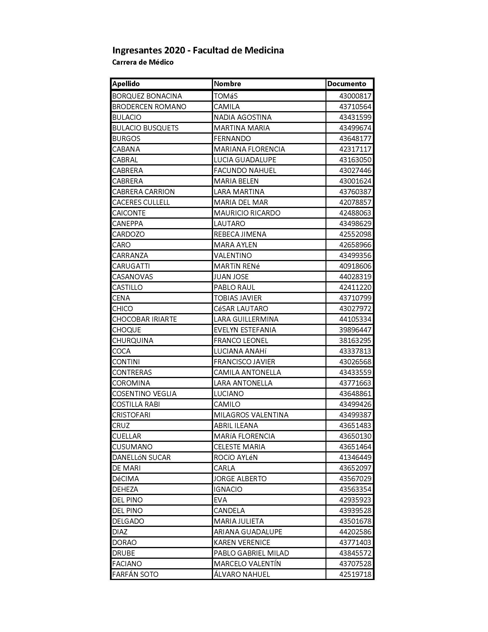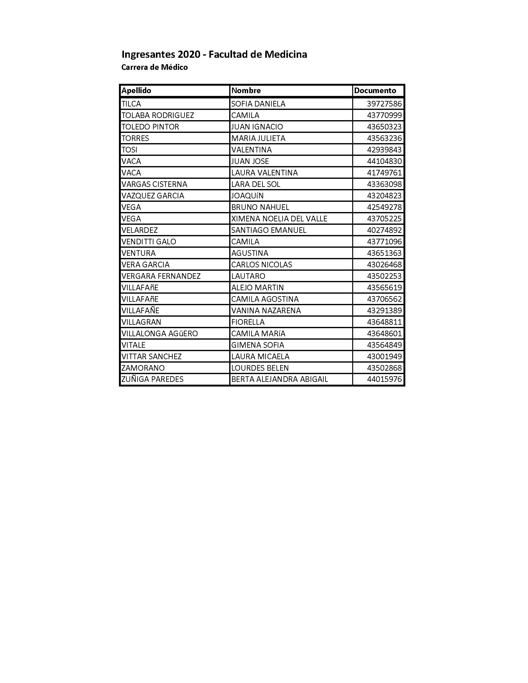 - La lista de ingresantes a la carrera de Medico como resultado de las Pruebas de Nivelación y Recuperación realizadas en febrero de 2021.
