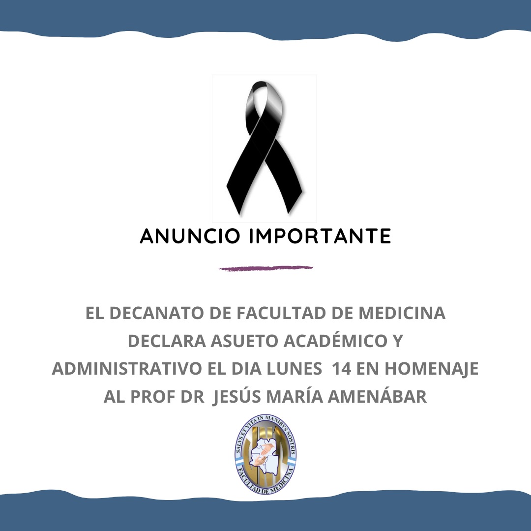 Ante el fallecimiento del Prof. Dr. Jesús María Amenábar, nuestra Unidad Académica recibió respetuosos saludos de condolencias, de autoridades de las Facultades de Medicina, nucleadas en Foro de Facultades de las Universidades Nacionales de: