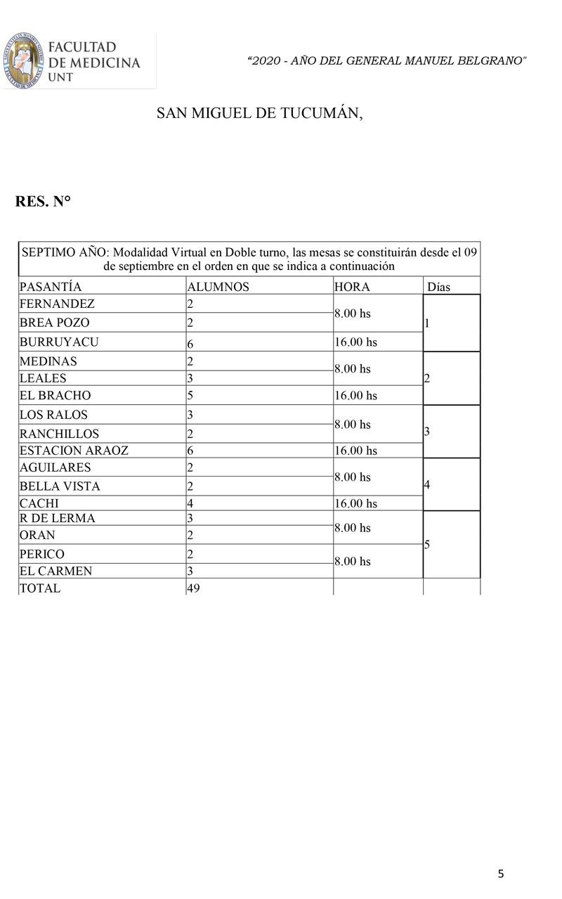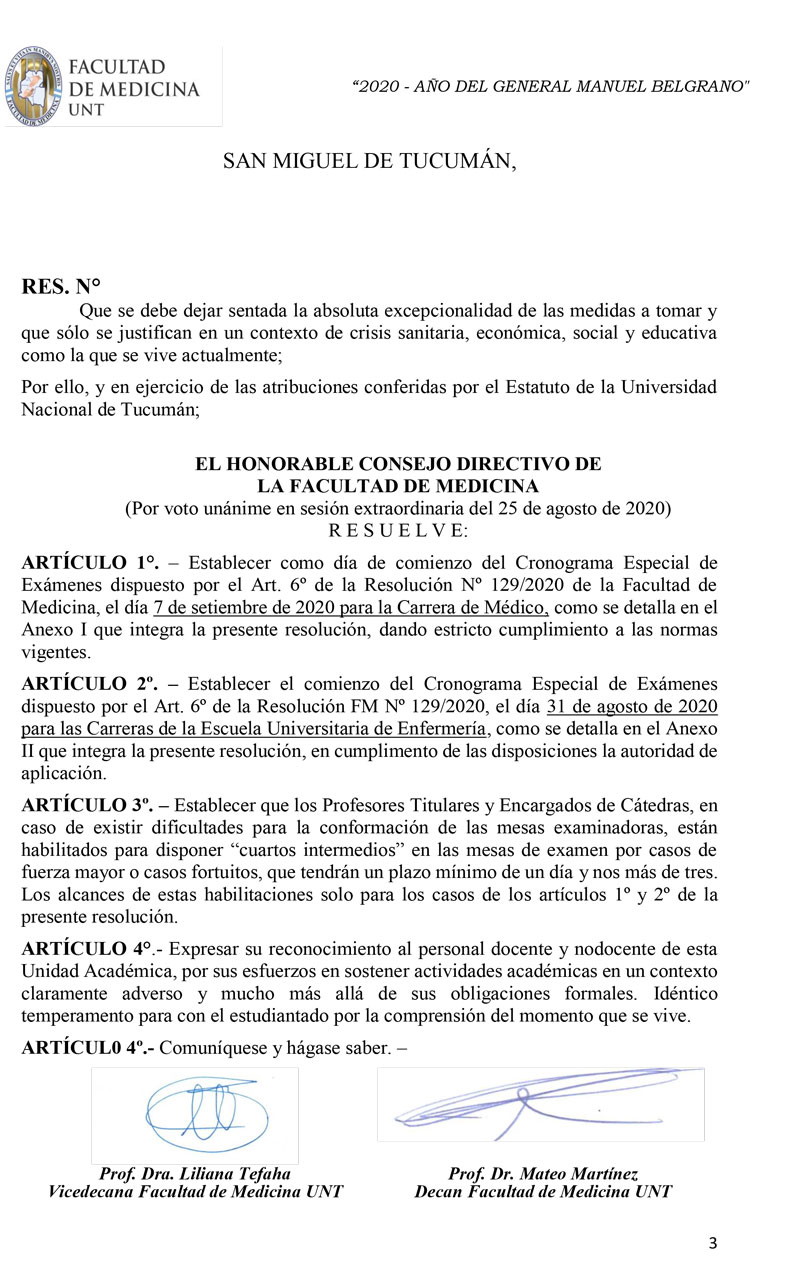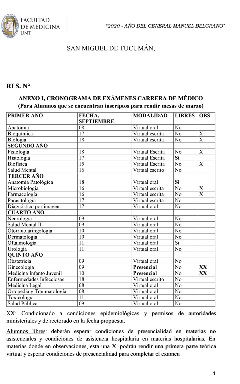 La resolución dictada incluye a inscriptos para rendir el turno correspondiente a la última mesa de marzo y al examen final de la pasantía rural cohorte octubre-abril de la carrera de médico. Una vez concluida esta mesa, se programarán nuevos turnos de exámenes.
