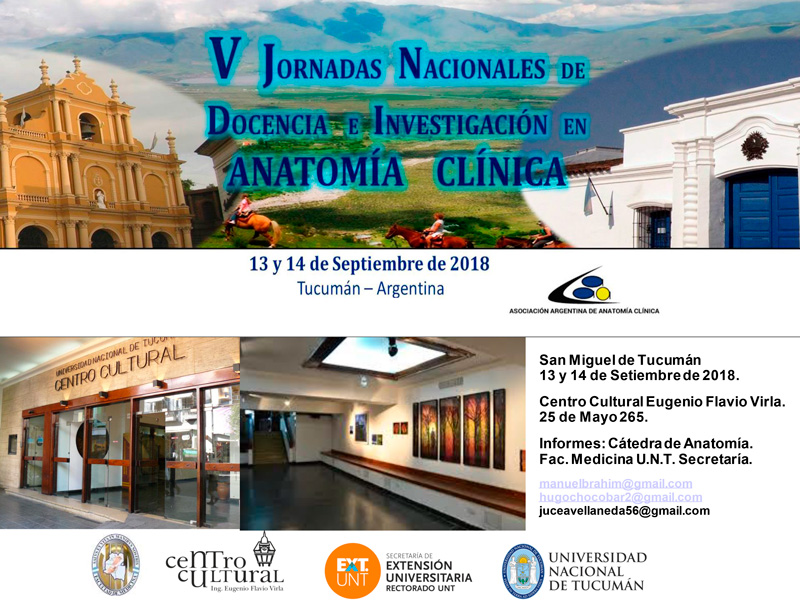 Durante los días 13 y 14 de septiembre de 2018 se desarrollará la "V Jornadas Nacionales de Docencia e Investigación en Anatomía Aplicada".