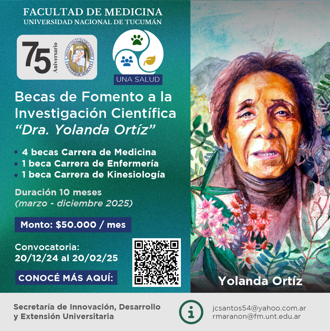 La Facultad de Medicina de la UNT lanza la convocatoria para las Becas de Fomento a la Investigación Científica “Dra. Yolanda Ortíz”. Estas becas están destinadas a estudiantes de las carreras de Medicina, Enfermería y Kinesiología interesados en participar en proyectos de investigación alineados con el enfoque de "Una Salud".