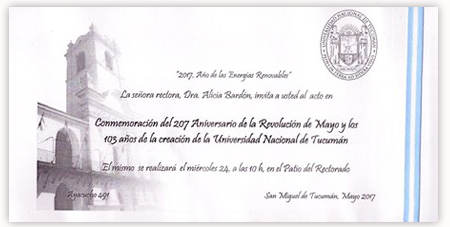 El Decano, Prof. Dr. Ricardo Octavio Zelaya y el Vicedecano, Prof. Dr. José Antonio Remis, junto a los integrantes del Gabinete hacen llegar a la comunidad de la Facultad de Medicina, sus salutaciones, en ocasión de conmemorarse el próximo 25 de mayo el 207° Aniversario de la Revolución de Mayo y el 103° Aniversario de la creación de la UNT.